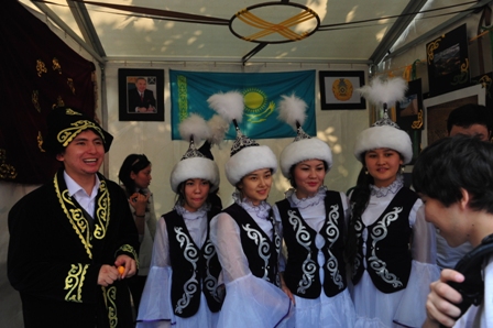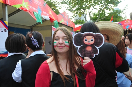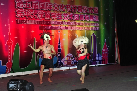 当日下午,33个国家的留学生在延安路校区新世纪餐厅广场举行的文化风情展吸引了上千名中外学生。越南学生在展台前立起漂亮的门楼;墨西哥“名厨”现场烹制地道的民族美食;巴基斯坦学生现场展示本国特色艺术——纹身画;韩国学生表演传统的“四物农乐”;中国学生的舞龙表演、传统游戏更是引来阵阵喝彩。各国的特色美食让大家一饱口福,穿着各国传统服饰的留学生引得大家驻足合影,独具民族风情的舞蹈和音乐,使得现场气氛高潮迭起。