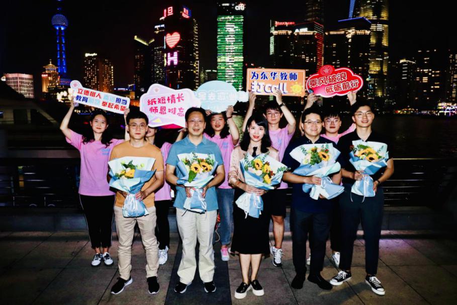 9月9日晚,师生代表前往外滩参加教师节庆祝活动,“外滩之窗”为教师送上节日祝福,学生代表为老师们献花,师生在热烈的氛围中共同庆祝节日。