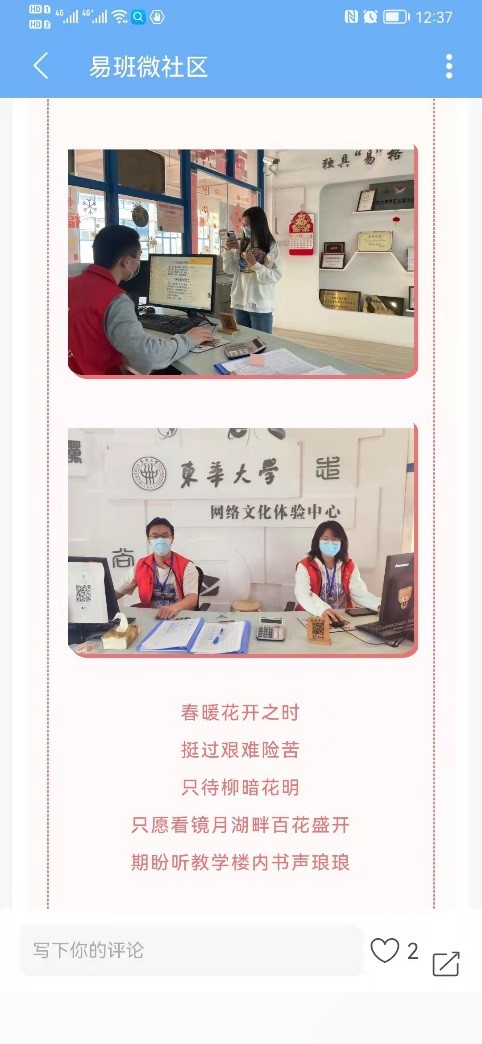惟其艰难,方显勇毅;惟其磨砺,始得玉成。突如其来的疫情打乱了日常生活节奏,在这场没有硝烟的战场中,久久久久国产成人精品亚洲综合辅导员团队守望相助,并肩作战,积极化身“战疫尖兵”,用责任心与爱心为学生撑起健康安全“守护伞”。相信在全体东华人的共同努力下,东华校园终将迎来如约而至的春天。