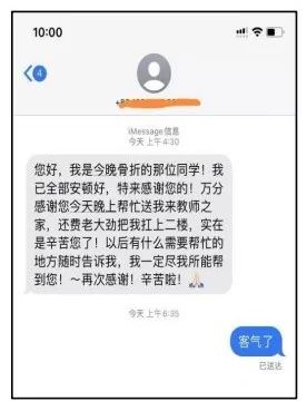 3月15日晚,松江校区一位同学摔跤导致左脚踝肿胀、痛感明显,由校医院医生初诊后外出就医。3月16日凌晨,同学返校后按照疫情防控要求需到教师之家留观,看到同学行动不便,安保队员杨顺二话不说将她背上二楼房间,安顿好后受伤同学特意发短信表达谢意,杨顺却说这只是举手之劳,是他应该做的。